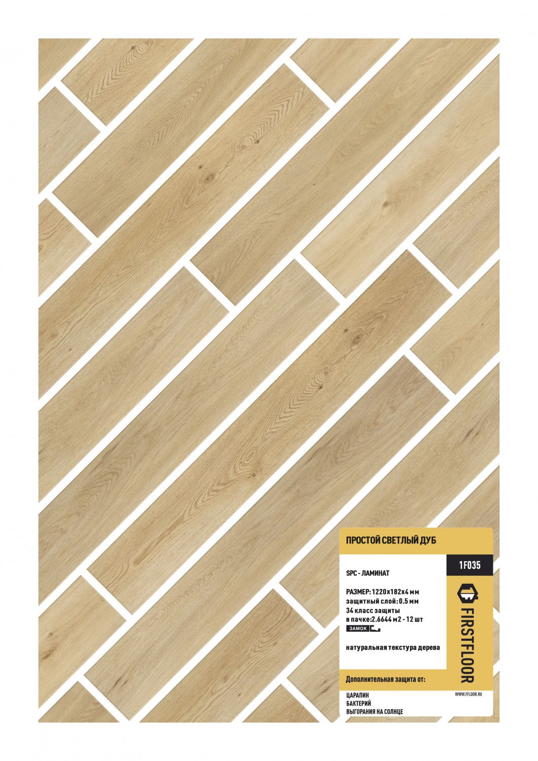 Для максимального соответствия деревянному покрытию, каждая плашка окрашивается в тон с цветом фаски. SPC-ламинат Firstfloor может использоваться с подогреваемыми полами в стяжке. Наши напольные покрытия подходят для широкого спектра помещений, включая кухню, ванную и туалет, благодаря их 100% водонепроницаемости.