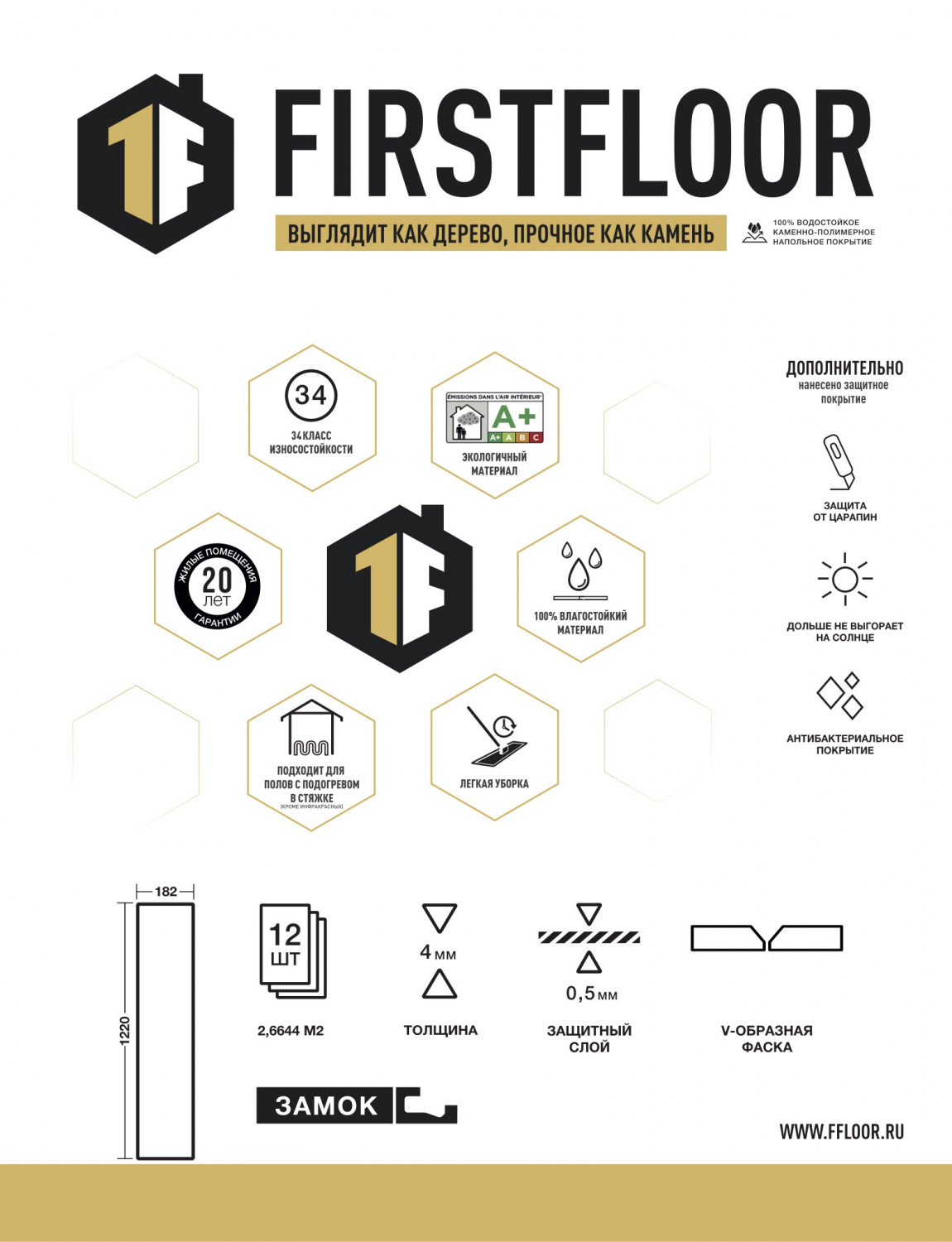 Для максимального соответствия деревянному покрытию, каждая плашка окрашивается в тон с цветом фаски. SPC-ламинат Firstfloor может использоваться с подогреваемыми полами в стяжке. Наши напольные покрытия подходят для широкого спектра помещений, включая кухню, ванную и туалет, благодаря их 100% водонепроницаемости.