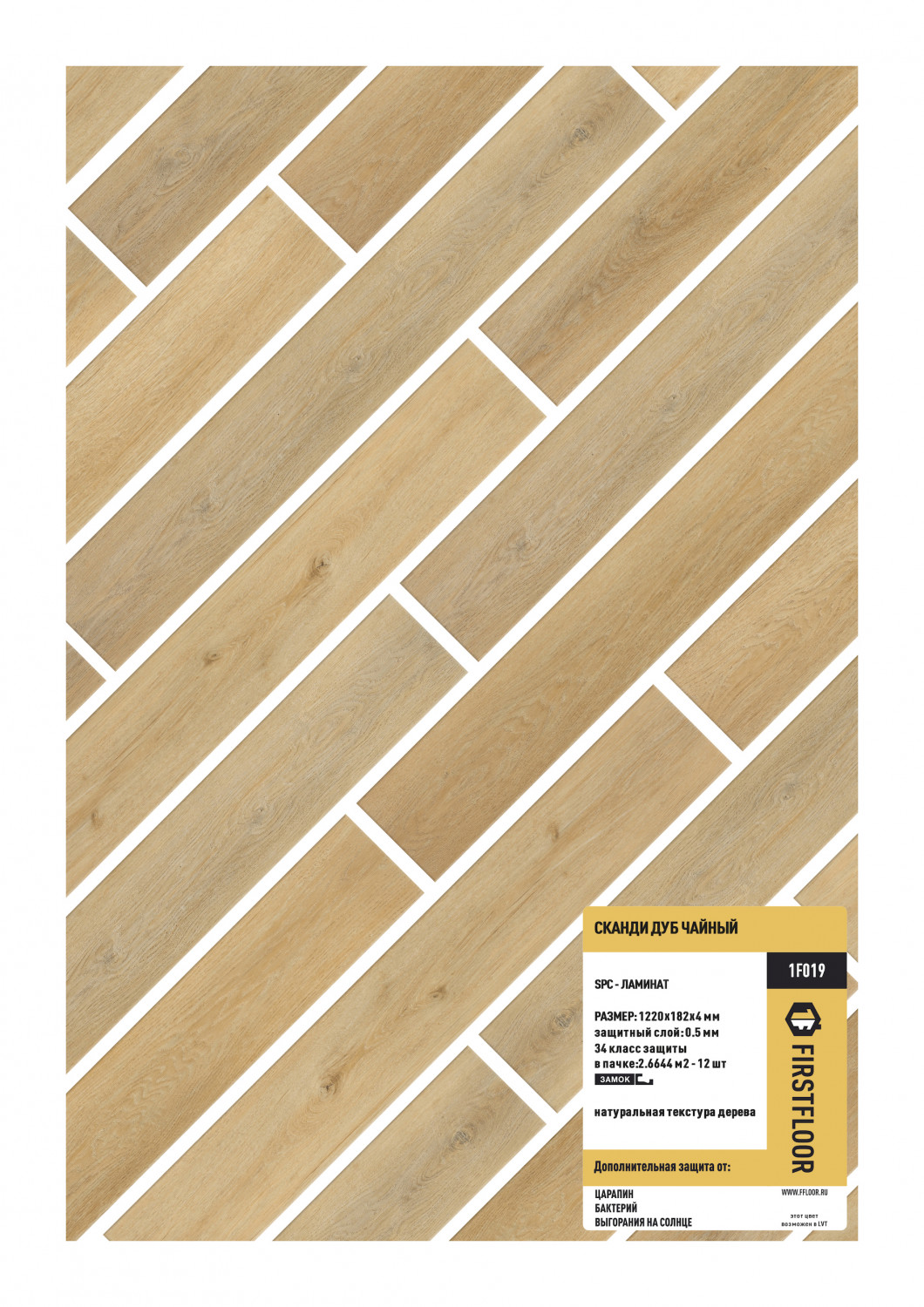 Для максимального соответствия деревянному покрытию, каждая плашка окрашивается в тон с цветом фаски. SPC-ламинат Firstfloor может использоваться с подогреваемыми полами в стяжке. Наши напольные покрытия подходят для широкого спектра помещений, включая кухню, ванную и туалет, благодаря их 100% водонепроницаемости.