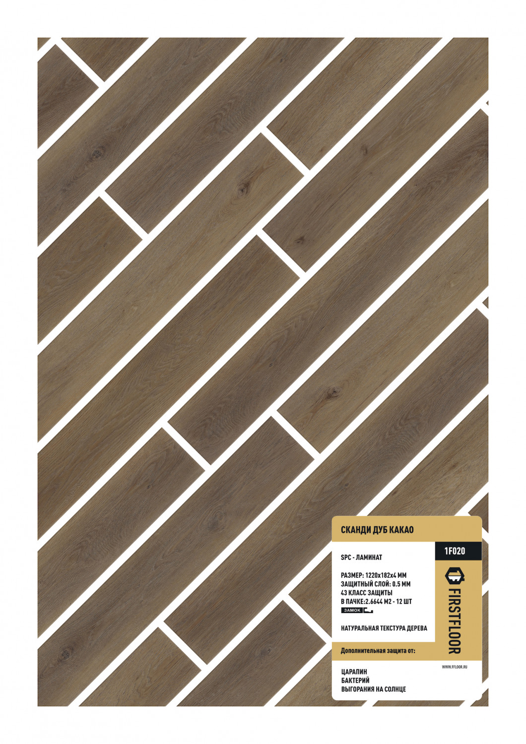 Для максимального соответствия деревянному покрытию, каждая плашка окрашивается в тон с цветом фаски. SPC-ламинат Firstfloor может использоваться с подогреваемыми полами в стяжке. Наши напольные покрытия подходят для широкого спектра помещений, включая кухню, ванную и туалет, благодаря их 100% водонепроницаемости.